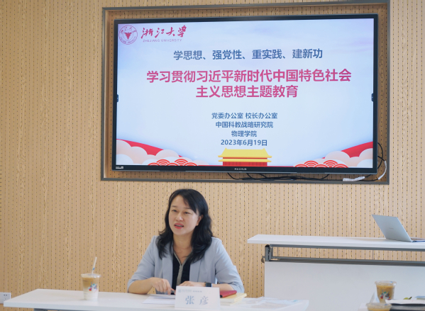 在学校第十五次党代会召开前夕,习近平总书记对学校作出重要指示,这既是对浙江大学改革发展的重要指导、对高校广大师生的亲切关怀,更是对高等教育服务中国式现代化的战略指引。结合本次主题教育,张彦介绍了学校在习近平新时代中国特色社会主义思想学习、宣讲和研究等方面的一些重要成果,包括中国特色世界一流大学的溯源研究、科技创新的相关论述研究、习近平外交思想浙江大学研究中心的建设等相关内容。她强调,对于本次主题教育,我们要始终把学思想放在首位,坚持读原著学原文悟原理,全面学习领会习近平新时代中国特色社会主义思想的科学体系、精髓要义和实践要求,做到整体把握、融会贯通。