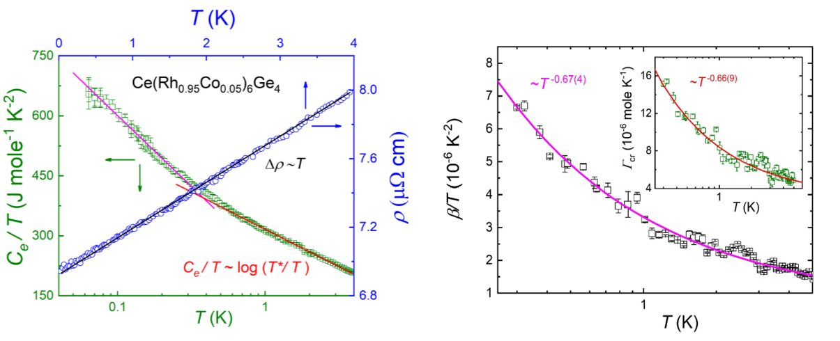 图3. Ce(Rh0.95Co0.05)6Ge4中发散的格林艾森常数和奇异金属行为