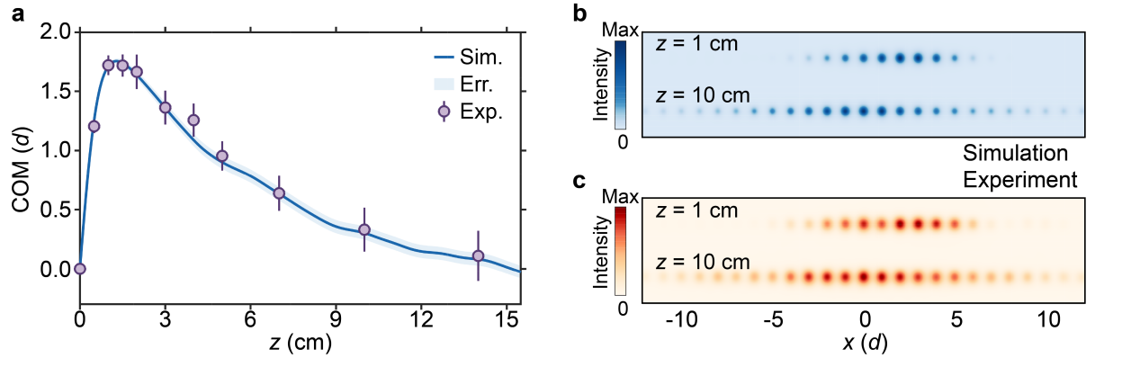 研究课题组基于光量子芯片,利用飞秒激光直写技术制备了一维无序波导晶格,构建了一个高度可控的光量子模拟器。在该系统中,光沿波导方向的传播(轴)等效于量子力学中的时间演化。课题组首先验证了该系统可以在无序晶格下支持安德森局域化,然后注入一个具有特定初始动量()的宽高斯光束,其质心轨迹明确展现出“远离—折返—回归”的完整过程,验证了光回旋效应。