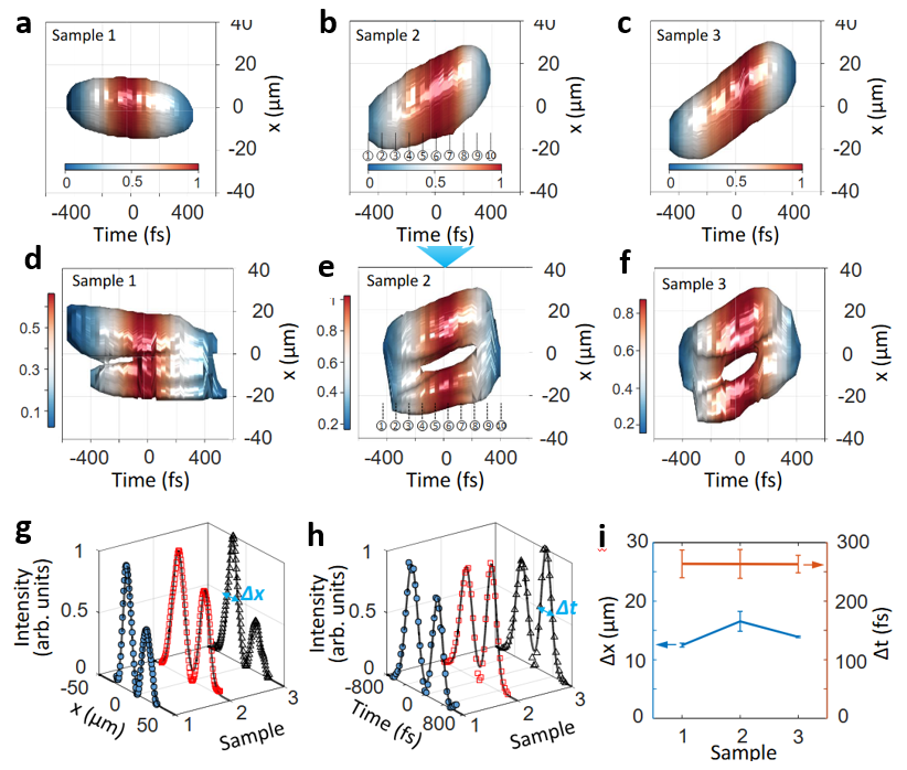 图2.实验验证光学时空微分器:(a-b)入射具有不同横向速度的“前倾光波包”;(d-e)经过光学时空微分器后,分别测量透射波包的时间-空间分布,验证了其对应于的模拟微分运算结果;(g-i)时空微分运算后的光学波包在空间和时间上的分辨率分别约为14微米和260飞秒。