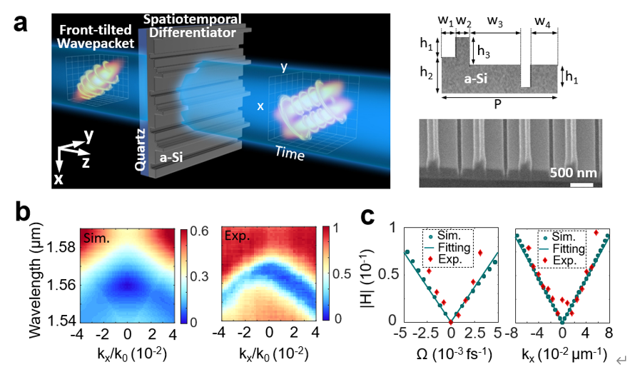 图1.光学时空微分器:基于镜面对称破缺的超构光栅,对于任意时空分布的飞秒超快光脉冲,进行时间-空间的模拟微分运算。