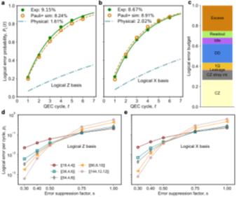 基于“昆仑”量子处理器,团队自主设计并在实验上演示了两种双变量自行车码, 码和 码。前者利用18个数据比特编码4个距离为4的逻辑比特,后者编码了6个距离为3的逻辑比特。通过执行高效的非局域稳定子提取线路,团队成功演示了多轮量子纠错。实验结果表明, 码和 码的平均逻辑错误率(按每轮、每逻辑比特统计)分别为8.91% 和 7.77%。此外,研究团队的数值模拟预测,在所采用的噪声模型与解码设定下,若能将当前芯片的物理操作错误率降低至现有水平的一半,则可跨越双变量自行车码的纠错阈值,为未来突破盈亏平衡点(即逻辑比特寿命超越物理比特寿命)提供重要基础。
