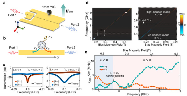 基于这一机制,研究团队进一步构建了YIG与复合左右手传输线耦合系统(图3)。实验中,一个直径约1 mm的YIG小球被放置在传输线边缘,并施加沿z方向的静态偏置磁场。实验结果表明,在负折射率频带中,仅有一个传播方向的信号能够与磁振子发生耦合并产生明显吸收,而另一方向几乎不受影响;当系统进入正折射率频带后,耦合方向发生完全翻转。通过连续扫描外加磁场,研究人员获得了整个通带范围内的非互易响应:在负折射率频带中磁振子主要耦合右向传播通道,而在正折射率频带中则转而耦合左向传播通道(图3d、3e)。这些结果表明,在固定能流方向下,光子与磁振子的耦合方向由折射率符号决定,从而将自旋–折射率锁定直接体现为光子–磁振子之间频率调控的手性耦合。