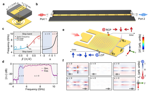 为在实验中实现这一机制,研究团队设计并构建了一种复合左/右手传输线超材料波导(图2a、2b)。测量结果表明,在较低频率通带中系统处于左手传播模式,对应负折射率;在较高频率通带中则进入右手传播模式,对应正折射率。当系统跨越切换频率时,传播常数符号发生改变,有效折射率也随之由负转正。