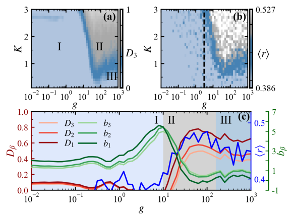 为验证理论预测,研究团队利用广义分形维度与能级间距统计方法对系统的Floquet本征态进行了直接分析,如图4所示。结果表明,该体系在参数空间中存在多体动力学局域化与去局域化两种相,其中局域化在中等相互作用强度及强驱动条件下被破坏。此外,多体动力学局域化表现出近可积性与多重分形特征,且分形维度与能级间距比随相互作用强度的变化呈现出明显的非单调行为。这一结果凸显了多体动力学局域化的涌现特征,也验证了映射方法的有效性。
