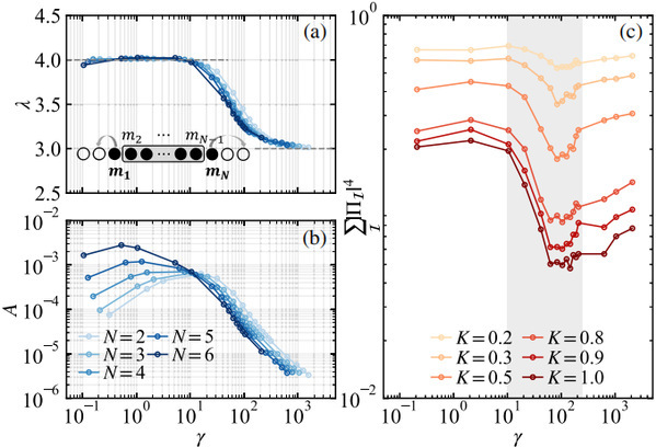 在弱驱动极限下,研究团队进一步发展了跃迁项的普适解析公式,可适用于任意多粒子数。基于此,研究团队揭示了幂律行为及其转变在不同粒子数下具有普遍性,如图3(a-b)所示。对映射模型本征态的逆参与比分析表明,幂律行为的转变导致其在中等相互作用下趋于遍历性,如图3(c),预示多体动力学局域化将在该参数区域首先发生破缺。
