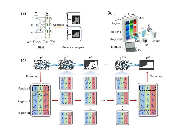 近日,光学与量子信息研究所阮智超教授课题组提出了一种光子受限玻尔兹曼机,该方案通过空间光调制器将模型参数编码到不同波长的振幅与相位上,实现了高效的光学吉布斯采样,利用光场传播过程加速生成任务。基于非冯·诺依曼架构的光子计算优势,该方案不仅消除了处理器与内存之间的数据传输瓶颈,还降低了吉布斯采样的计算复杂性,显著提升了大规模受限玻尔兹曼机的计算效率。实验结果进一步证实,该系统在图像生成、图像修复及音乐序列生成方面均展现出强大能力。这一进展为新兴的光子计算领域提供了关键的生成式架构,对克服传统冯·诺依曼架构下的“存储墙”瓶颈、构建新型高效生成式AI系统具有重要意义。