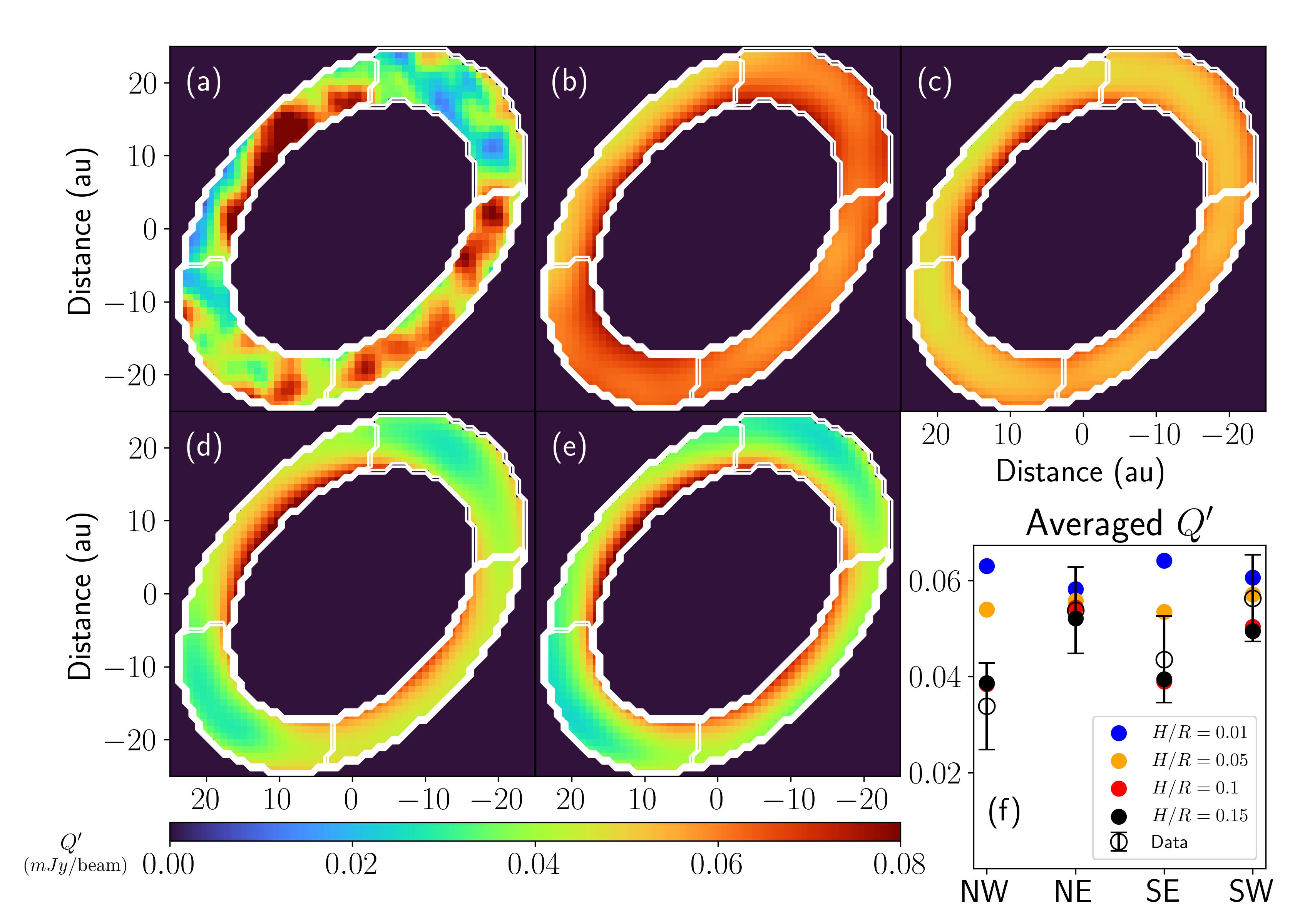 图二,第一个环的在不同尘埃尺度高度(H/R)下辐射转移模拟结果与观测数据的对比。H/R必须至少0.1才能解释观测到的偏振信号分布。