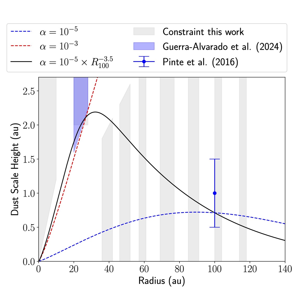 颠覆均匀湍流模型: 将这些约束条件整合,研究团队发现,无法用一个恒定的湍流强度参数(α)来描述整个HL Tau盘。相反,湍流水平从外向内急剧增强,需要α值从100 au处的约10⁻⁵跃升至20 au处的约10⁻².⁵。这一接近3个数量级的剧烈变化,挑战了传统上认为原行星盘具有均匀湍流的模型。