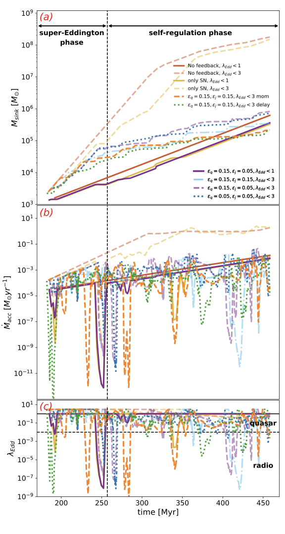 随后,黑洞进入第二阶段——自我调节的亚爱丁顿增长期。在此阶段,反馈能量持续抑制气体补给,使黑洞以低于爱丁顿极限的速率增长。令人意外的是,模拟显示,虽然超爱丁顿阶段可带来短期“跃升”,但强反馈会削弱后续气体供应,最终在红移 z∼10 时,持续爱丁顿极限吸积的黑洞反而比早期经历超爱丁顿增长的黑洞质量更大。