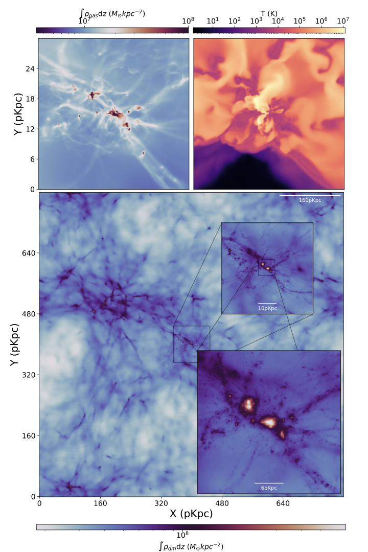 图一: 高分辨zoom-in 数值模拟在$z=10$ 时暗物质投影密度(下图)、气体投影密度(左上图)及气体温度(右上图)图。