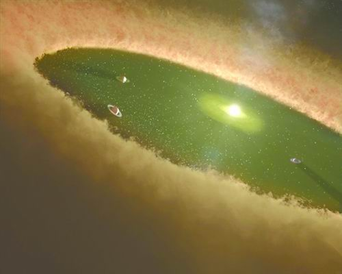 目前天文学家认为,太阳系诞生早期,气体盘演化到晚期时,太阳辐射的高能光子直射在气体盘上,形成的强劲光压首先吹散了靠近太阳的气体,使盘的内部出现中空结构,之后,光压又由内向外逐步驱散盘中的剩余气体。